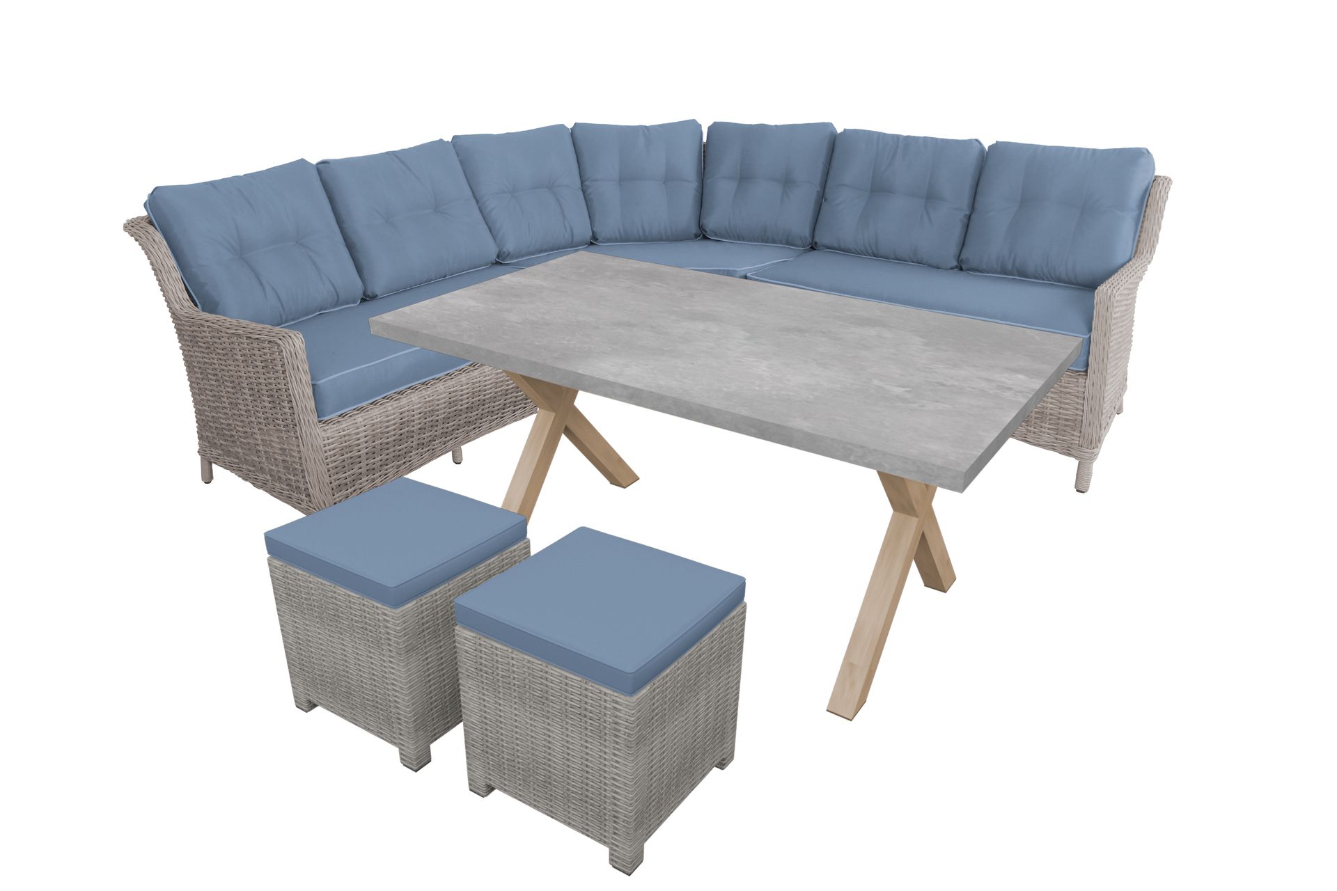 Ample room dining sets that are luxuriously comfortable and lounge sets that take advantage of dining height tables make this collection easily transitional. To enhance comfort, the Lagos dining chairs are deeper than standard dining ranges with plush cushions.
