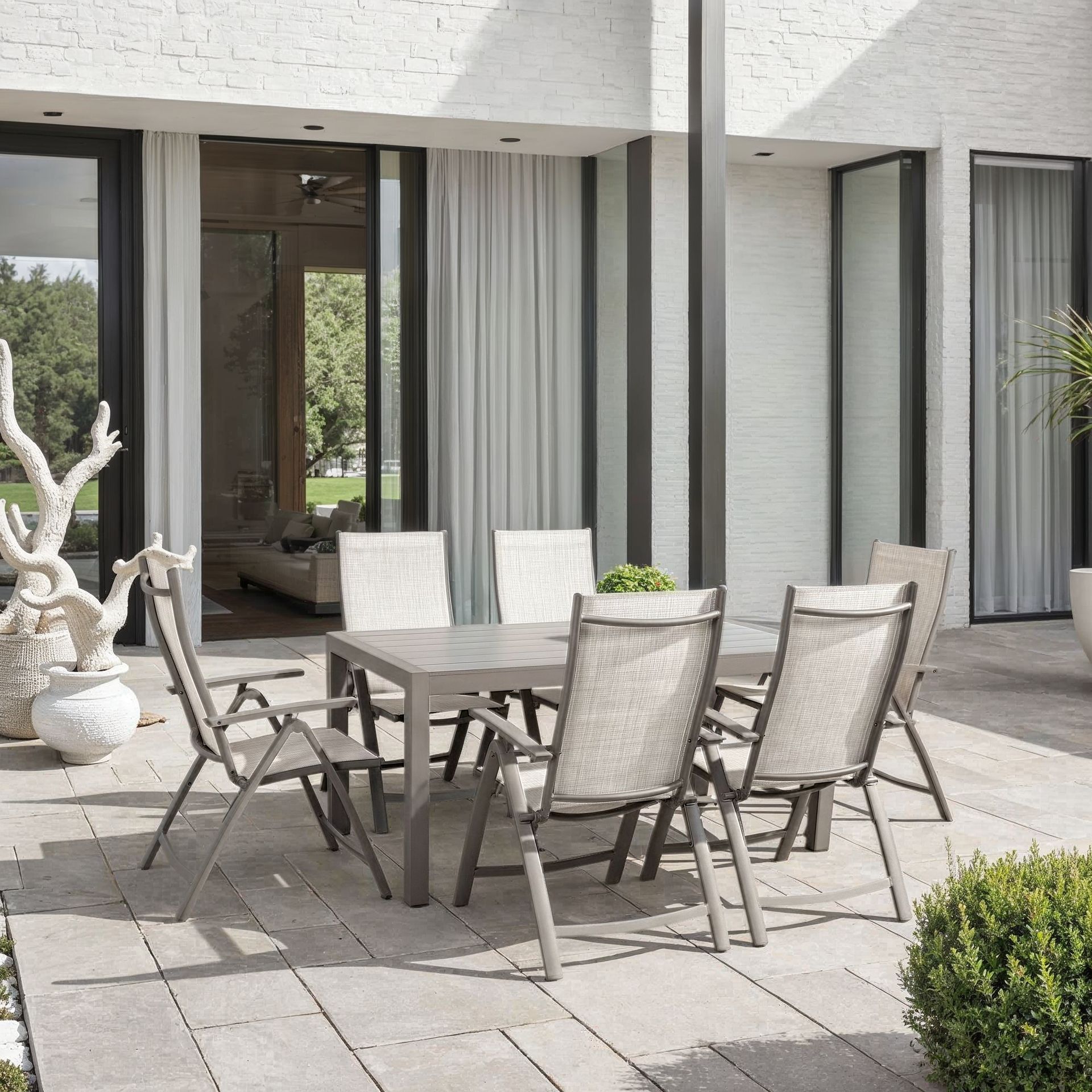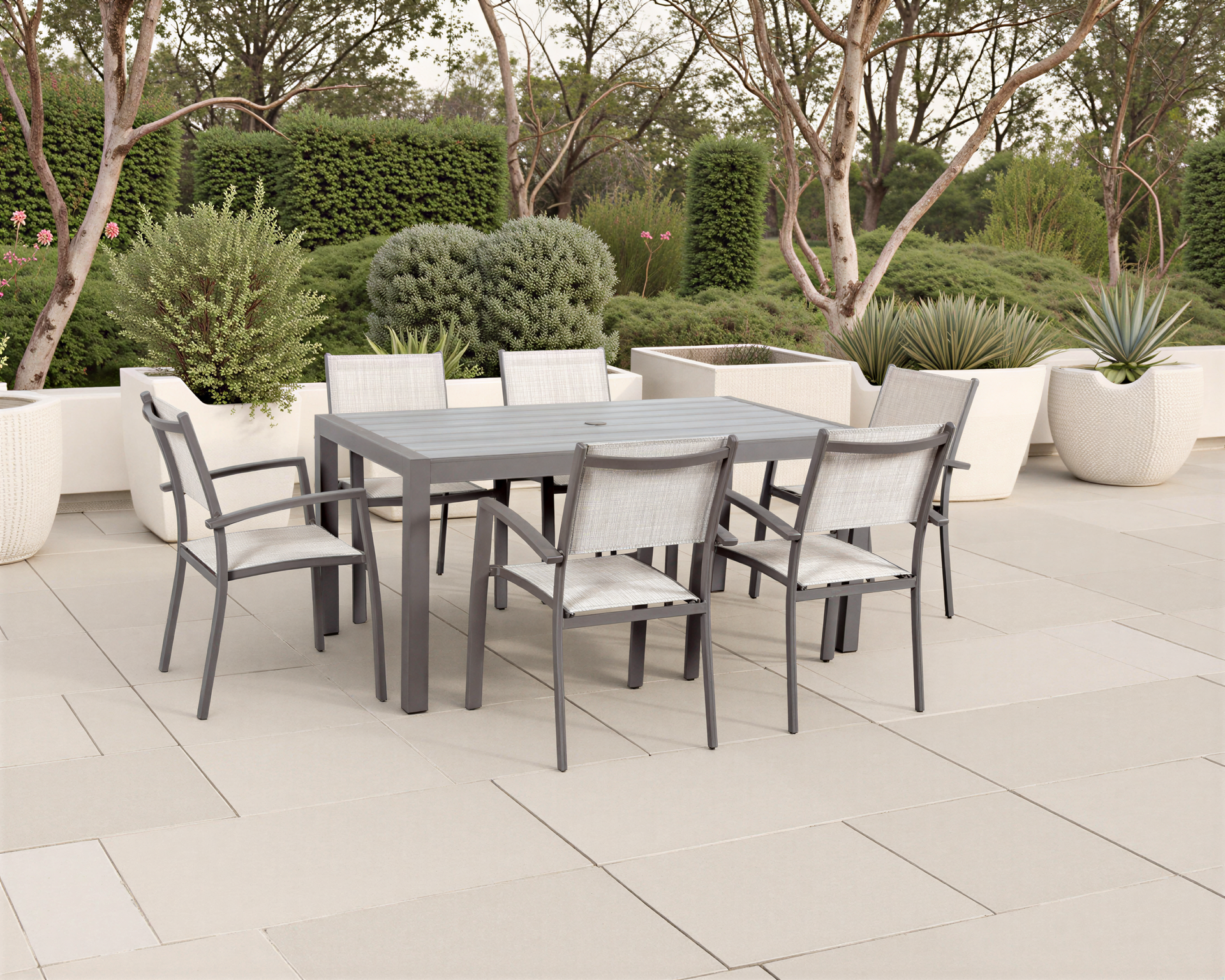 The heat-transfer wood-effect aluminium tabletops in the Milan Collection add a touch of natural elegance while remaining exceptionally durable and easy to maintain. Resistant to the elements, these surfaces are designed for both beauty and longevity.