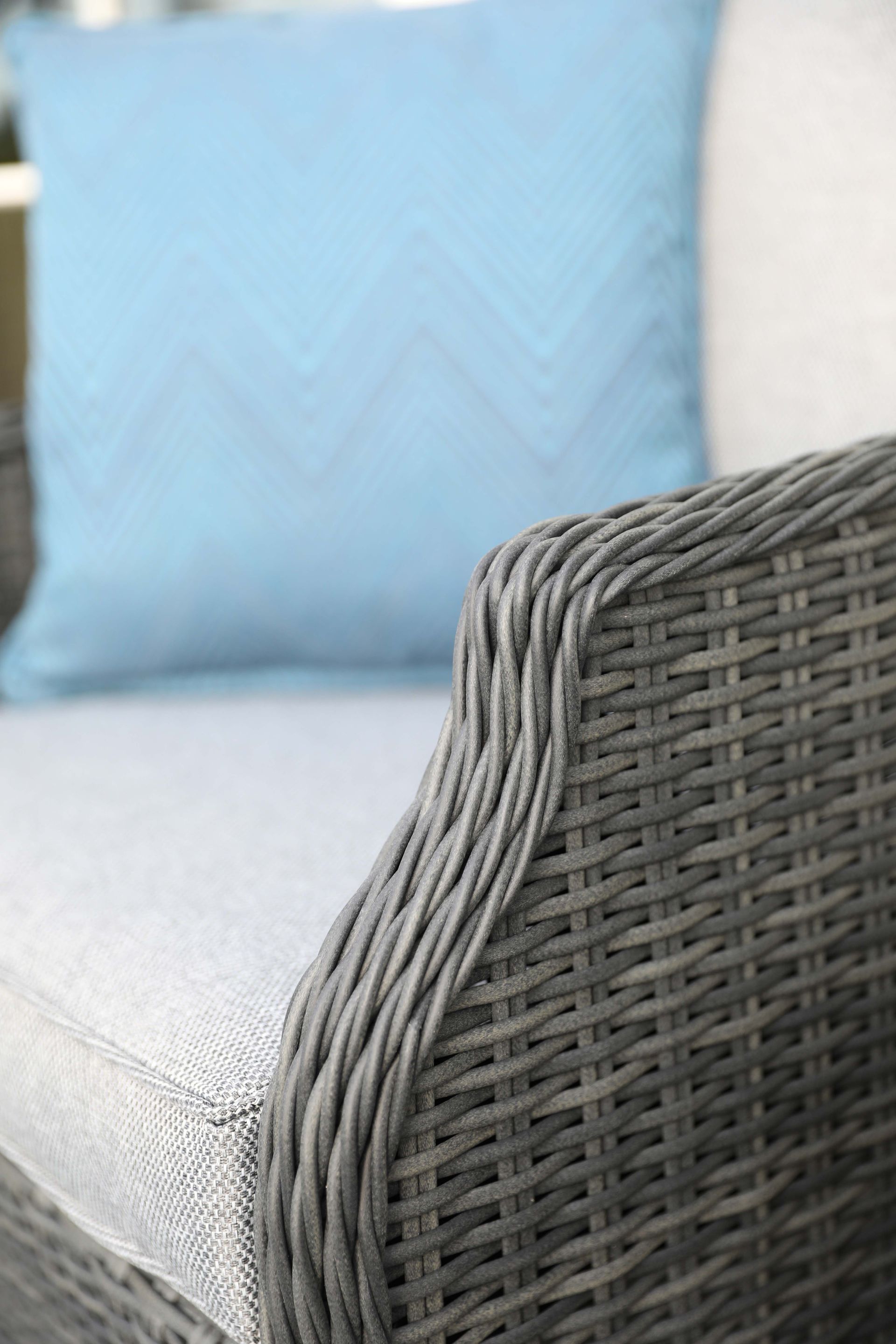 Elegantly curved detailing, characterises the timeless design of the Vienna collection. The Vienna In-Between set envelopes the classic 2-seat design, comprising of two ample lounge chairs for blissful comfort and a compact in-between table. The range gives a high level of distinction using two weave profiles, the 5mm half-moon is handwoven around the aluminium frames and complemented with 5mm round weave detailing the outer edges to enhance and give a level of refinement to this luxury product. The Flint coloured weave with a soft touch feel is complemented with Urban Black cushions which are zipped, the back covers have a button effect with an inner fastening device which allows the outer cover to be removed for easy cleaning.